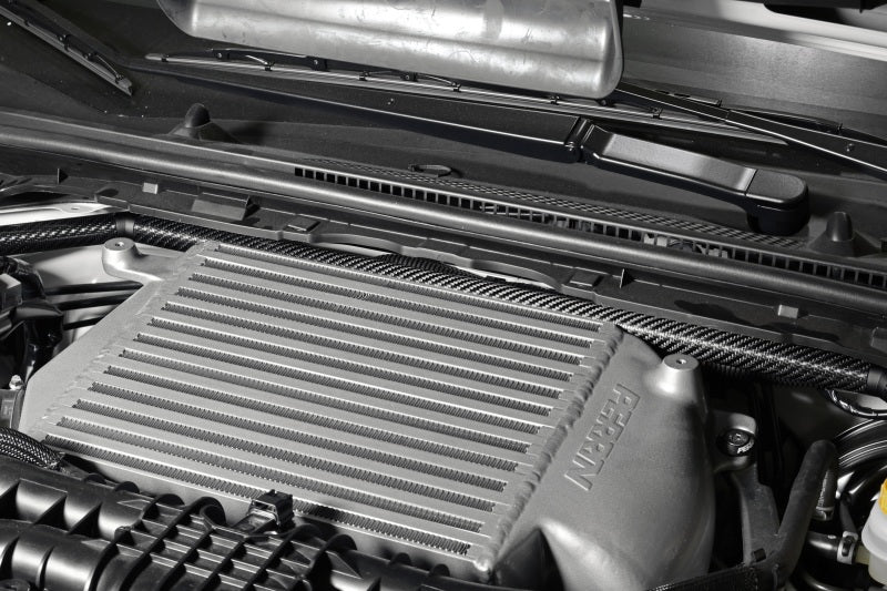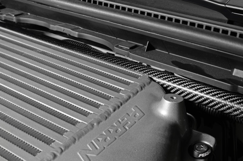 The Perrin Front Strut Tower Bar with Billet Feet Carbon Fiber provides high-strength chassis bracing and a premium carbon appearance for WRX and STI models.