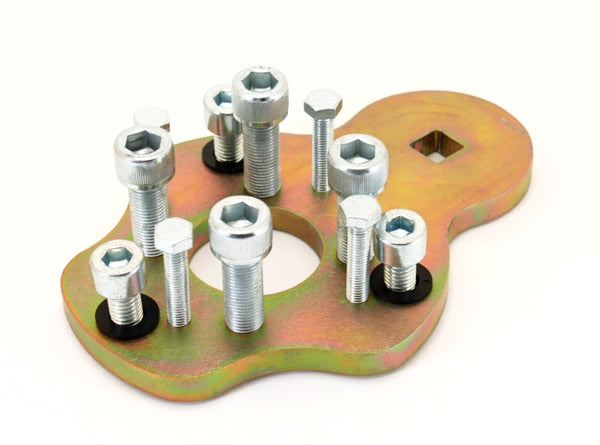 The long awaited answer to the antique Subaru pulley removal tool, bolts stuck through boards, and random screws welded to bars. Our tool was engineered with full compatibility in mind being able to work with our Lightweight Crank Pulley as well as BOTH styles of Subaru crank pulleys. It is the must have for any hardcore Subaru enthusiast or mechanic and will come with everything you need to do thousands of installs! Heavy duty is the name of the game, laser cut from a 9.5mm plate of 12L14 and yellow zinc chromate coated for longevity. We even incorporated a 1/2" socket wrench location so that you can put all might into it.