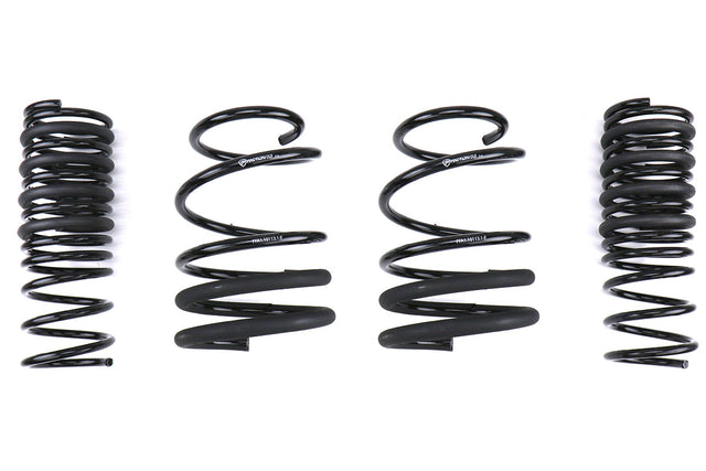 These springs are precisely engineered to optimize the handling performance of your car by taking advantage of factory strut valving and travel through increased spring rate and mild drop. They feature a moderate drop, front and rear, to eliminate the factory uneven ride height while not over-lowering the car and effecting the factory suspension geometry and vehicles dynamic characteristics. The linear spring rate offers a predictable and controllable ride while offering a modest increase in spring rate to reduce body roll and provide better handling characteristics.